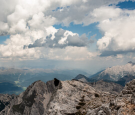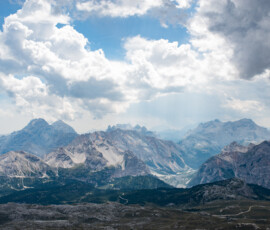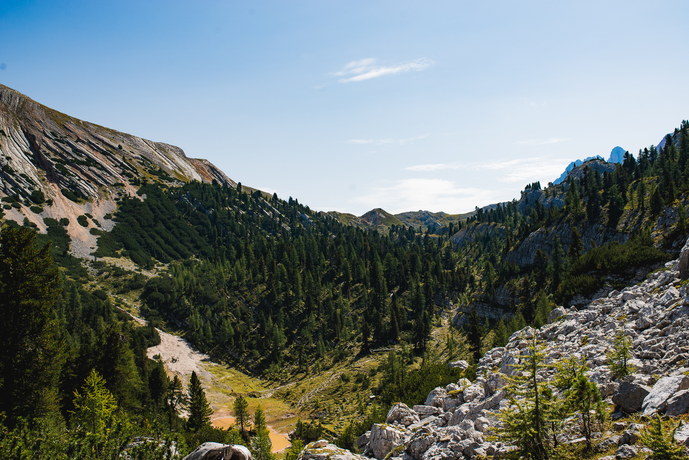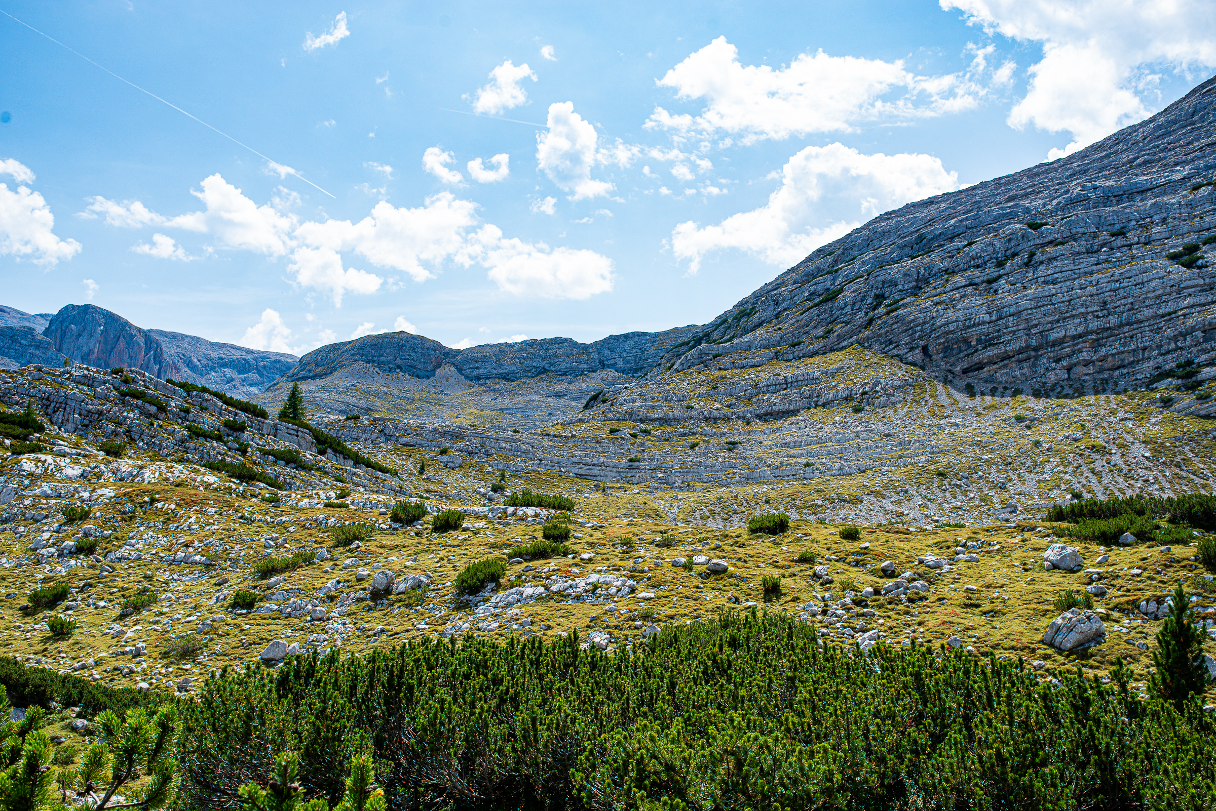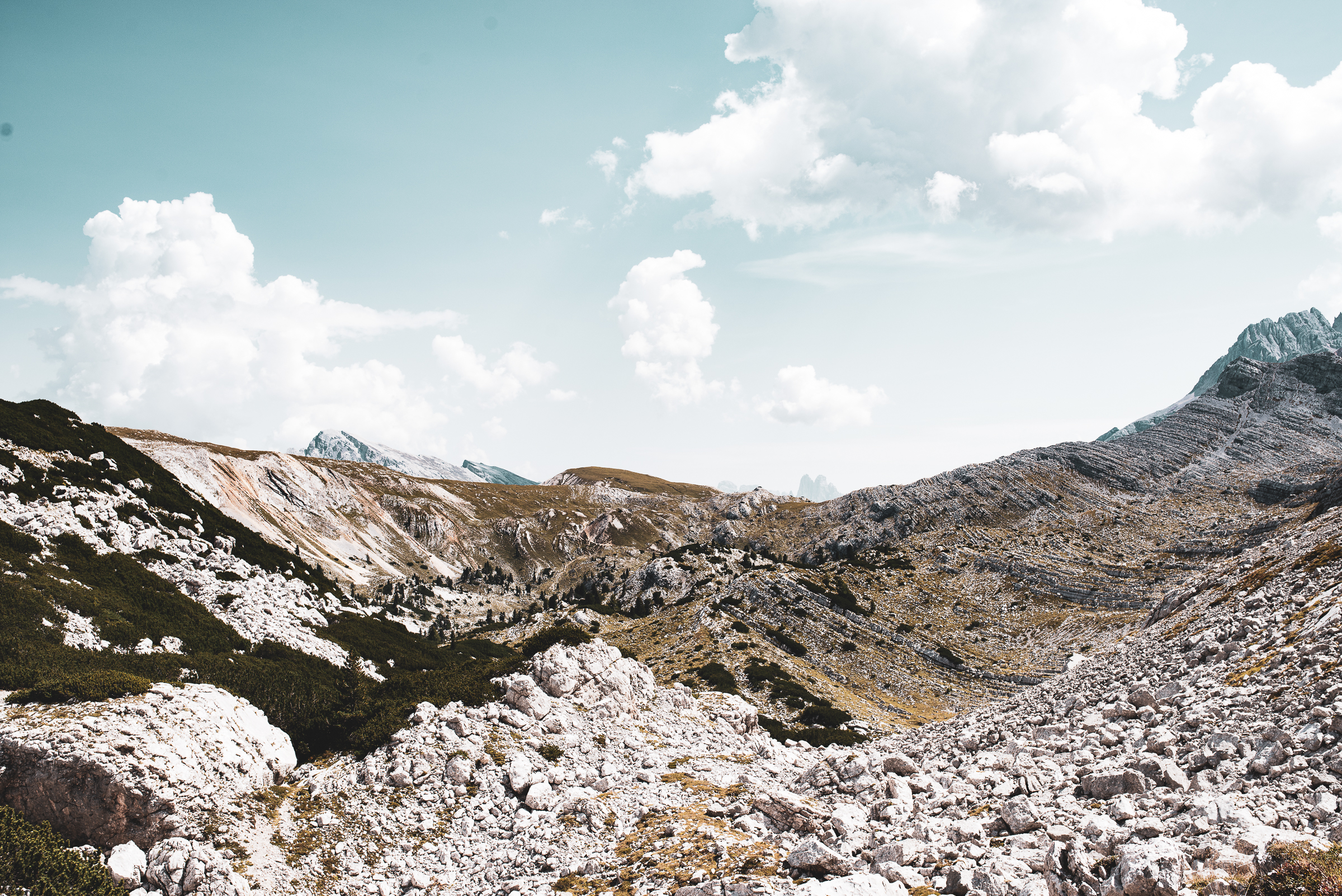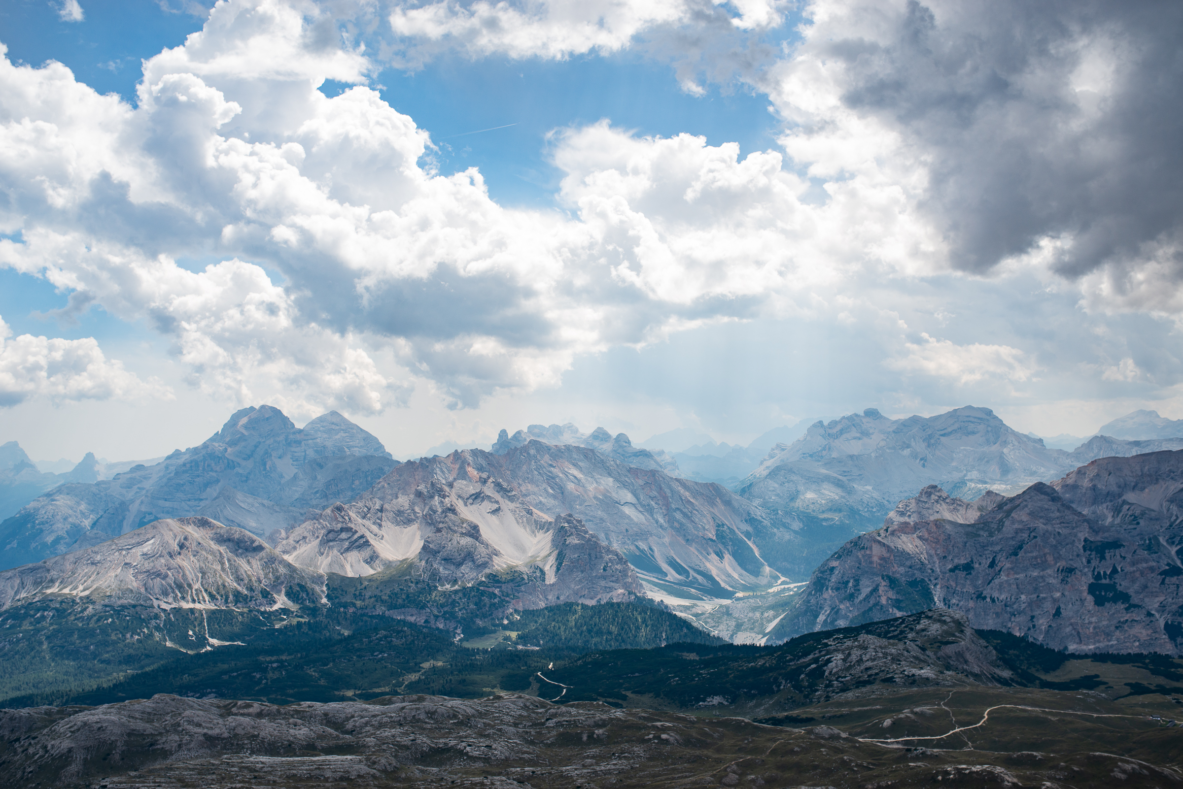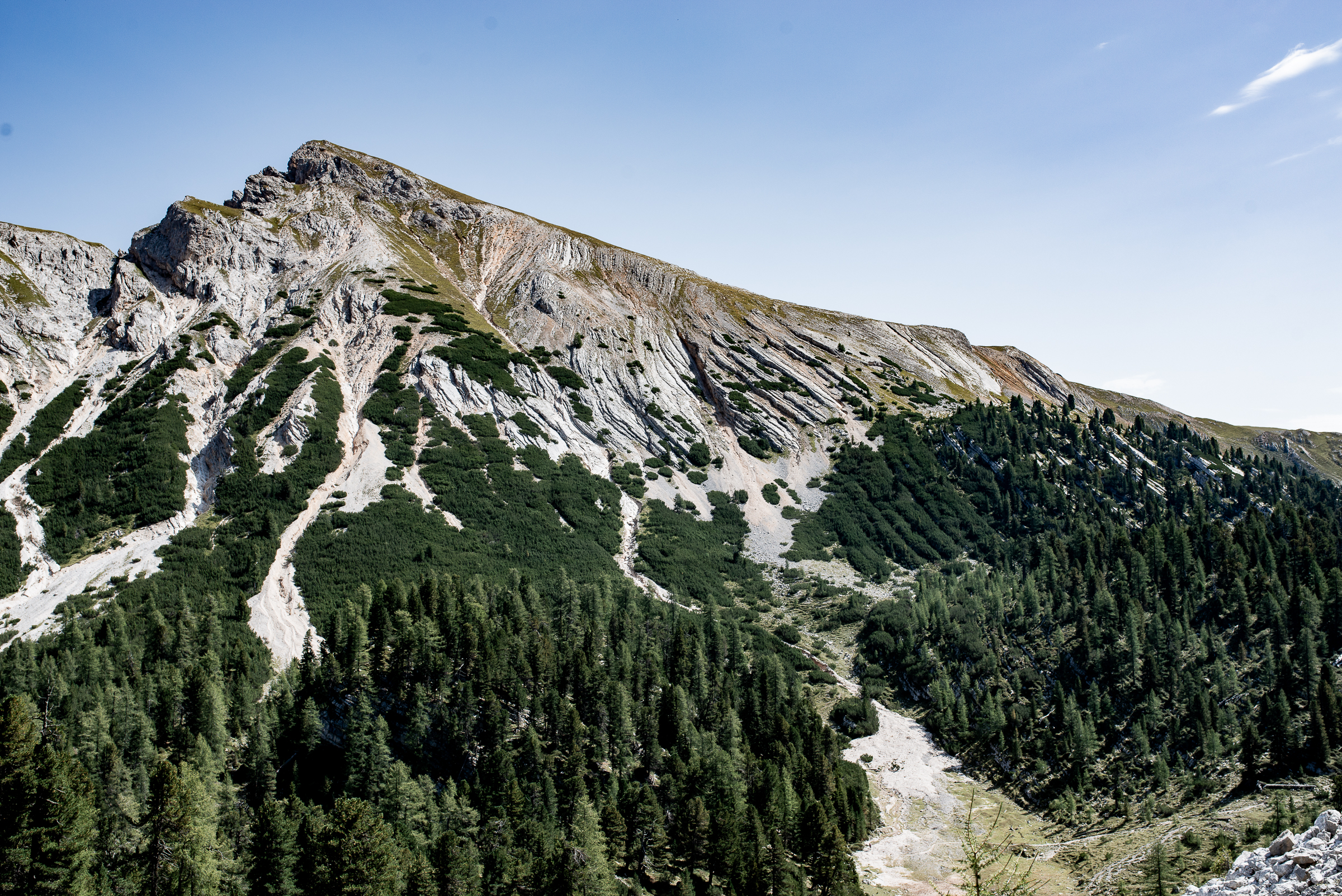 Oben angekommen, öffnete sich die Landschaft. Gipfel hinter Gipfeln, die typische Silhouette der Dolomiten: spitze Türme, steile Wände, Täler dazwischen.