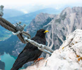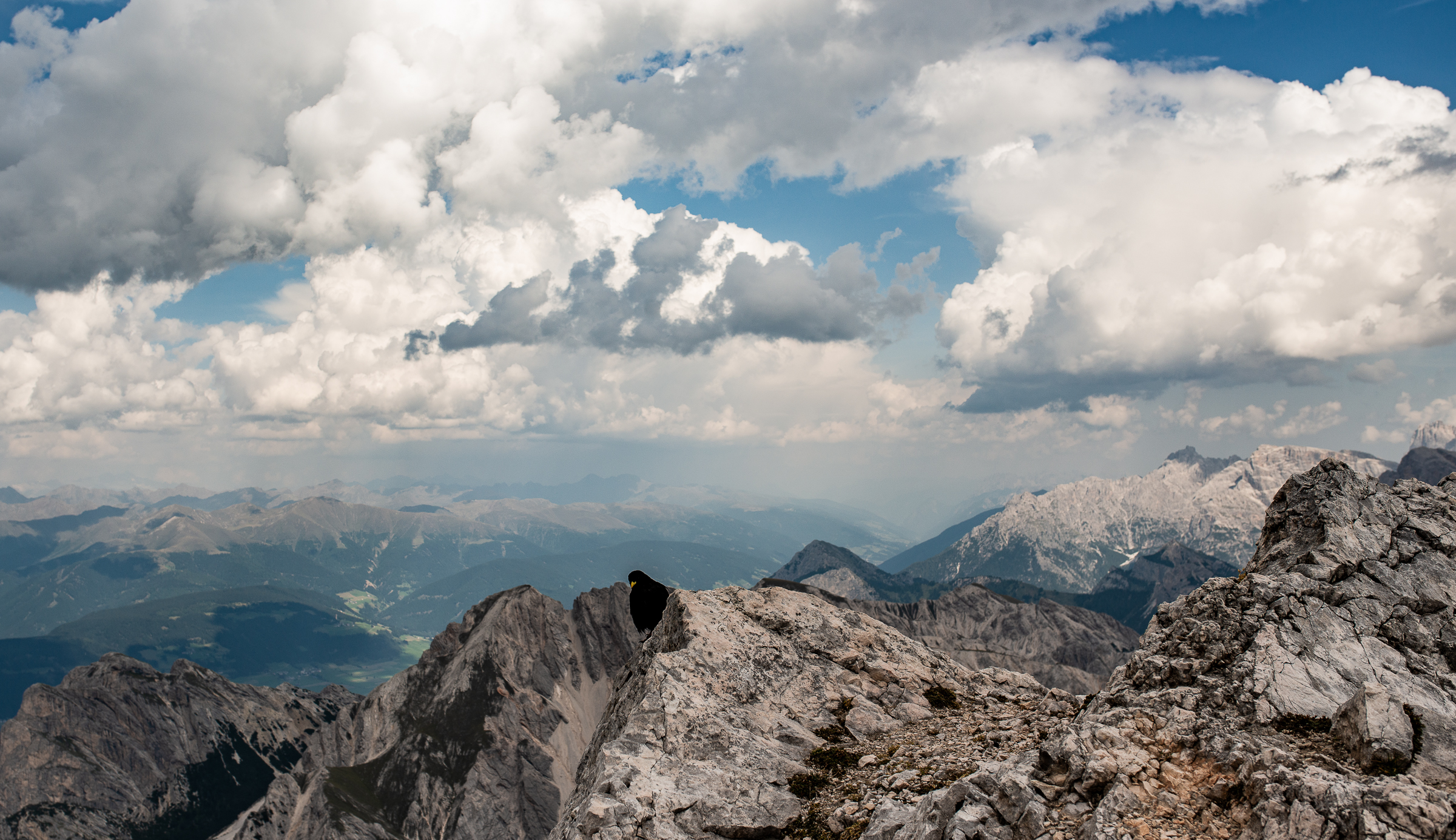 Und dann: Alpendohlen. Schwarze Vögel, geschickt in der Bergluft, die kurz nach unserer Ankunft auftauchten und die Situation sofort in Beschlag nahmen. Die Alpendohle (Pyrrhocorax graculus) ist ein klassischer Bewohner des Hochgebirges, oberhalb der Baumgrenze zuhause, bekannt dafür, Wanderern gegenüber wenig scheu zu sein. Auf dem Gipfel sassen sie quasi neben uns — tiefschwarz vor dem blauen Himmel, ein starker Kontrast zu den hellen Felsen. Perfektes Fotomotiv.