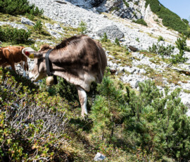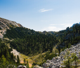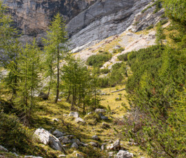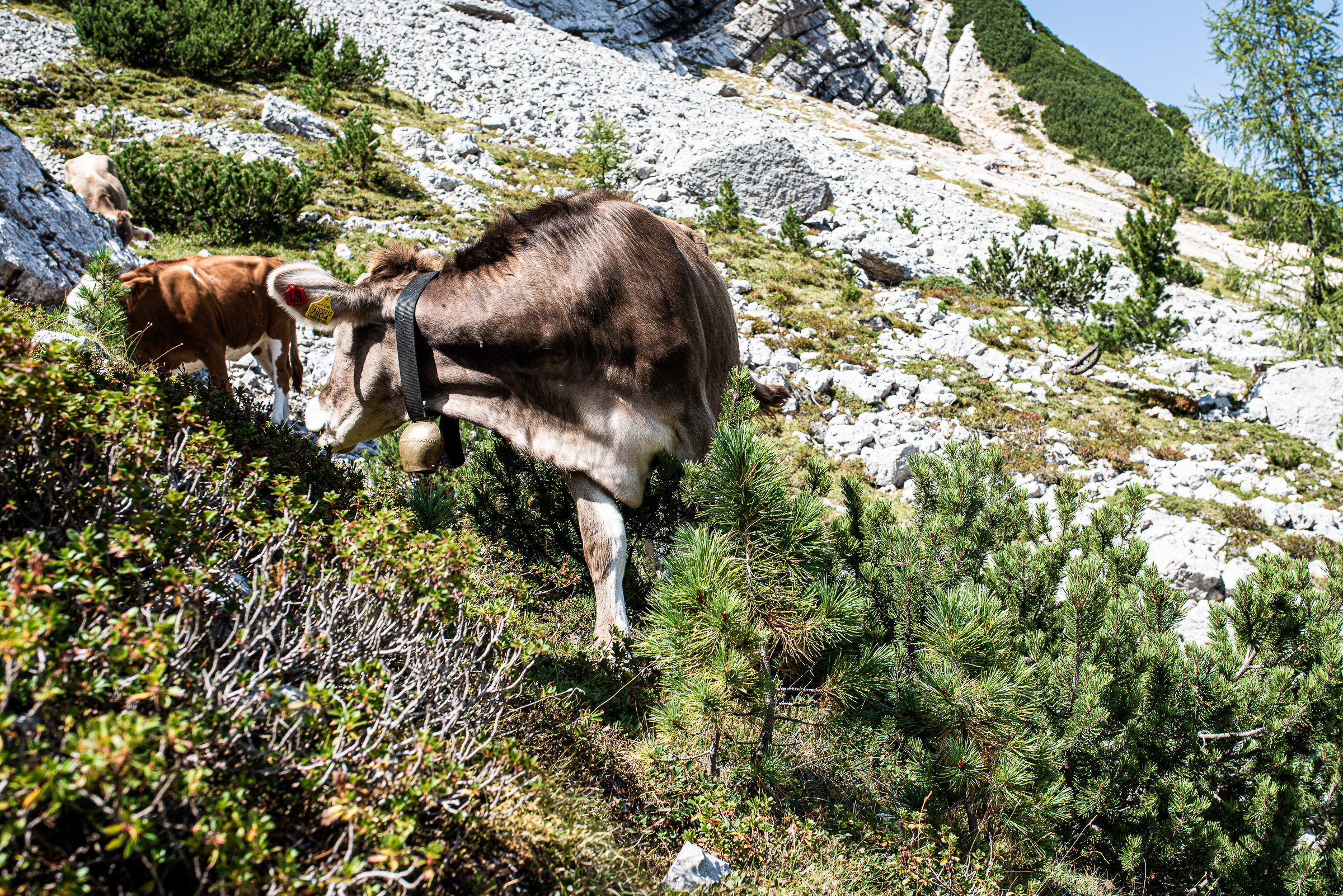 Zunächst durch dichte Wälder. Die Dolomiten haben Wald, den viele nicht erwarten — dicht, dunkel, riechend nach Harz und feuchter Erde. Dann öffnet sich das Gelände, Almwiesen tauchen auf, der Weg wird steiler.